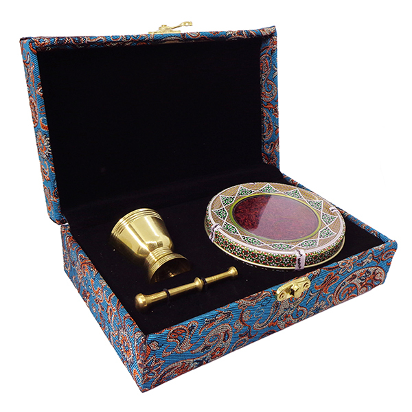 A beautifully crafted decorative bowl filled with premium saffron threads, sealed to preserve their aroma and quality. The intricate design on the bowl reflects timeless artistry, making it a keepsake even after the saffron is enjoyed.